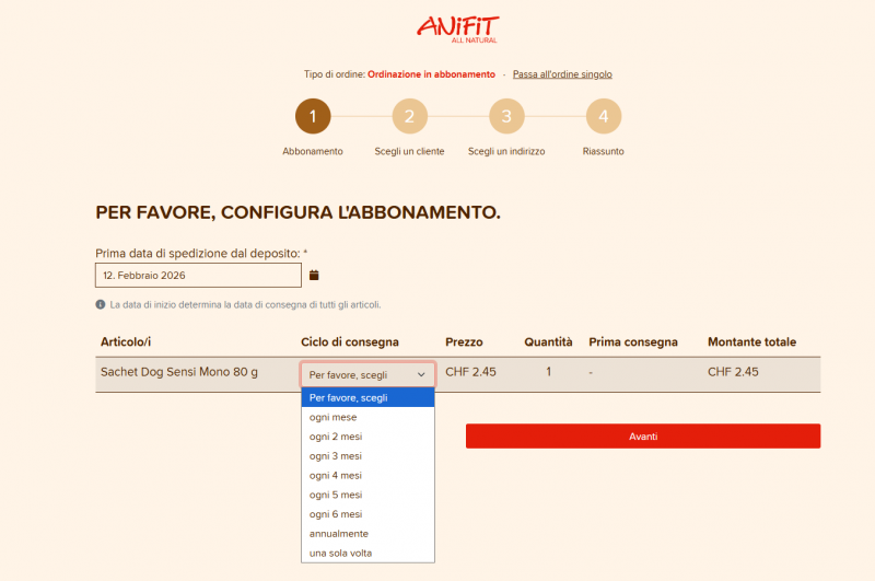 Poi determina la prima data di spedizione e quanto spesso vuoi che il prodotto ti sia consegnato (ciclo di consegna mensile, bimestrale, ecc.).